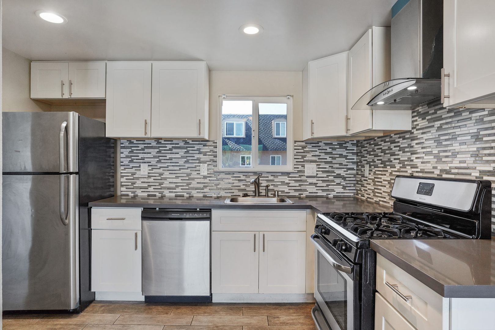 Available for rent is a spacious 1200 square foot, 2 bedroom / 1.5 bathroom townhouse apartment spread over two levels that has been completely remodeled with modern cabinets and quartz counters in the kitchen and bathrooms, modern plumbing fixtures, and stainless steel appliances. Enjoy hardwood style laminate flooring throughout and a spacious outdoor balcony. Entry level has the kitchen, living room, and half bath. Upstairs are two bedrooms and a shared bathroom. One bedroom has a large walk in closet.